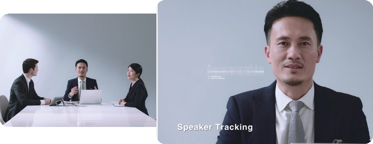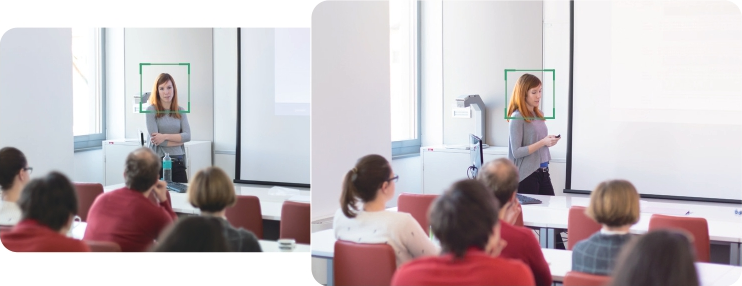 Отслеживание докладчика гарантирует, что камера следует за докладчиком при его перемещениях по комнате во время выступления, всегда удерживая его в центре внимания. Таким образом, удаленные участники получают сопоставимый объем визуальный информации по сравнению с присутствующими в комнате.